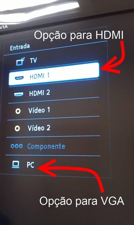 Após escolher o cabo de conexão (VGA ou HDMI) é preciso verificar se a TV está configurada para receber o sinal. Para isso é preciso usar o botão SOURCE (fonte), que seleciona a fonte que esta enviando a imagem. Esse botão existe em todas as TVs modernas.