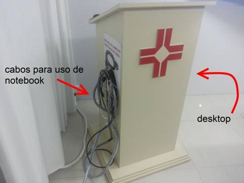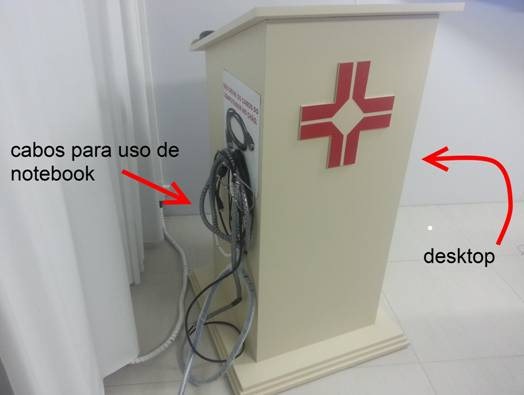 Para a conexão com o notebook selecione a opcao HDMI 2. Os cabos para conexão de notebooks estão pendurados no púlpito.