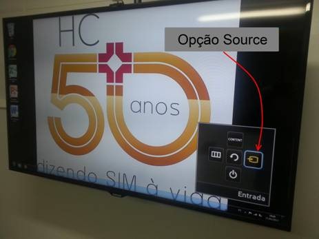 Após ligar a TV e o Desktop é preciso selecionar a fonte de imagem da TV. Para isso use o controle remoto e clique no botão SOURCE.
