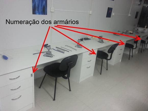 As chaves de todos estes armários estão em um único molho no armário número seis. A chave do armário número seis fica na coordenação da Disciplina de Ortopedia.