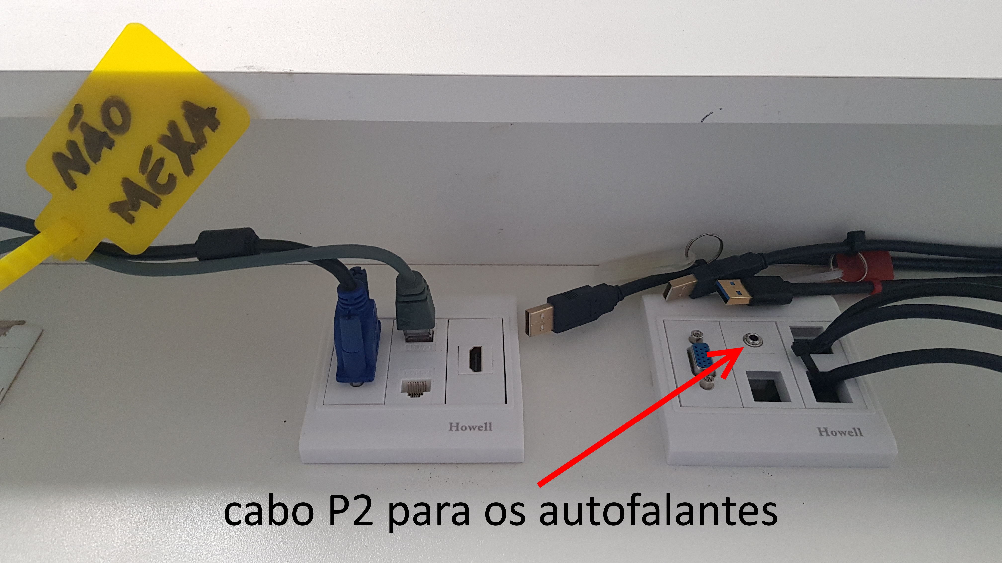 Para reprodução do som pelo sistema de áudio do auditório é necessário conectar o computador a um cabo P2-RL.
