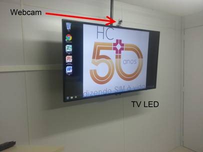 A sala da ortopedia esta equipada com projetor, computador desktop, duas câmeras de gravação de áudio e vídeo, uma câmera de projeção, cabos HDMI e VGA para conexão de notebook e lousa interativa.